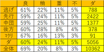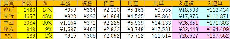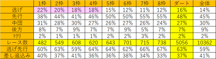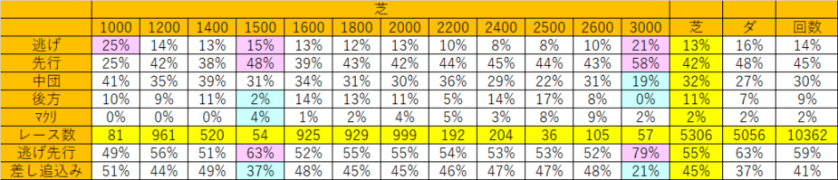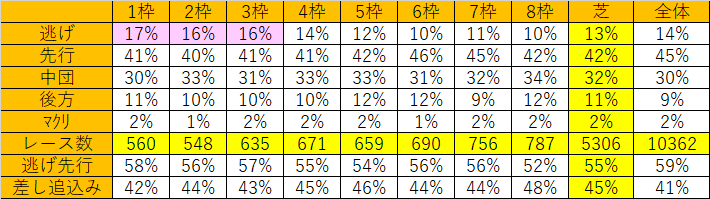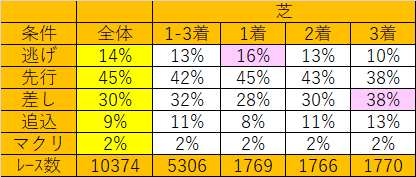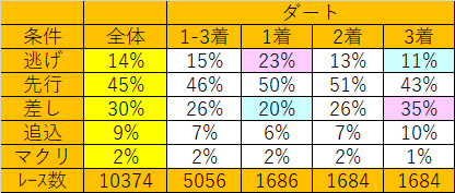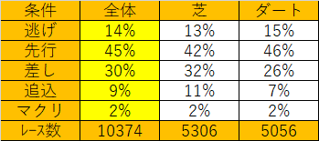 上の表は脚質別の芝ダートの3着以内の脚質確率です。