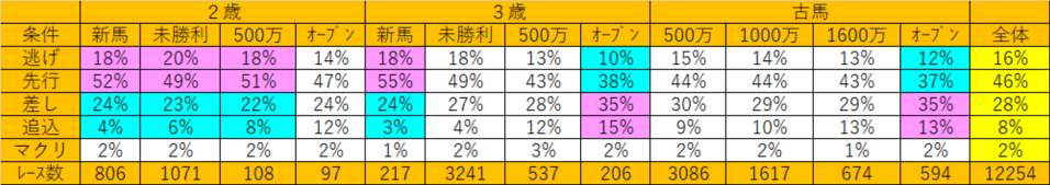 2歳戦は逃げ先行有利で、3歳、古馬のオープン戦は逃げ先行と差し追込みが半々の結果となっています。