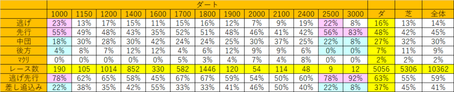 ダ1000m、ダ2500m、ダ3000mで逃げが多い結果となっています。
