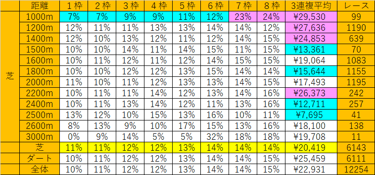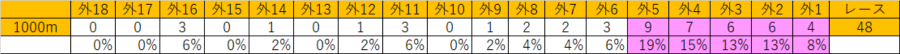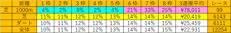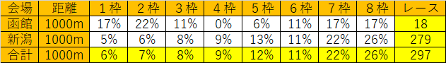 1000mの外枠が他に比べて高いのがわかります。これは新潟千直の外側有利が関係しています。