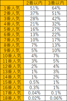 上の表は人気順の2着以内と3着以内の確率になります。