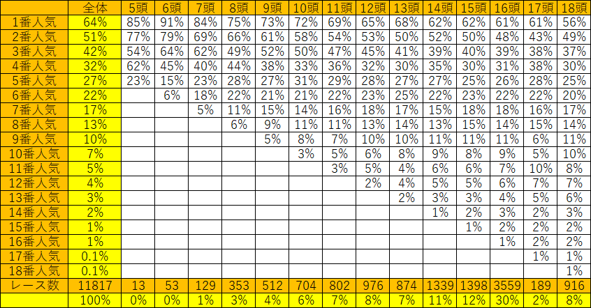 上の表は人気順の頭数別の3着以内の確率です。