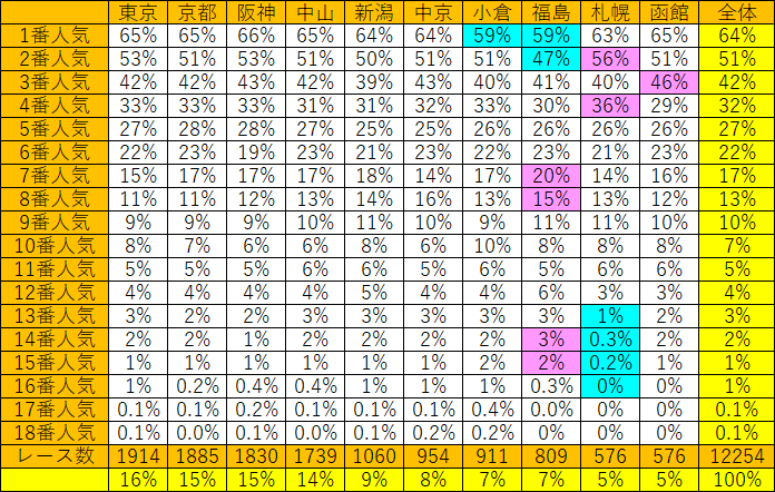 小倉・福島は1・2番人気の3着以内の確率は全体平均に比べて低いので、少し荒れやすい開場です。札幌・函館は2・3番人気が全体平均に比べて高いので、本命が来やすい開場です。