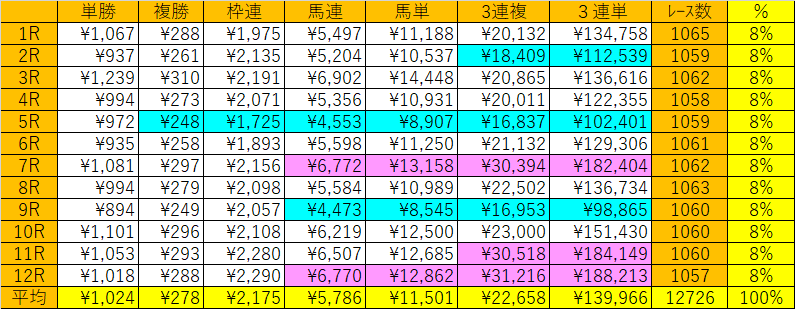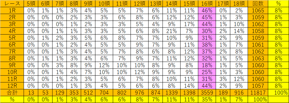 全体的に16頭が多いが、9R・10Rは他に比べて、12頭以下が多い。