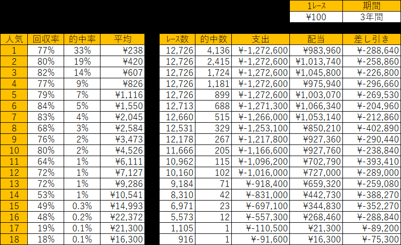 1番人気を同じ金額だけ買い続けたら、回収率は77%・的中率33%となります。3レースに1レース的中しますが、回収率は77%のため、負ける結果になります。例えば、16番人気を全5,573レースを買い続けたら、回収率は48%・的中率0.2%になり大負けする結果になります。また、左の表から分かるようにどの人気を買い続けても負ける結果になります。
