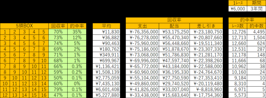 1〜5番人気の3連複5頭BOXの60点を同じ金額を買い続けた場合、的中率70%・回収率35%になります。