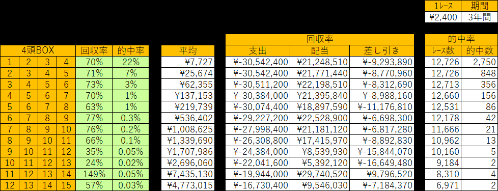 1〜4番人気の3連単4頭BOXの24点を同じ金額を買い続けた場合、的中率70%・回収率22%になります。11〜14番人気の回収率が149%となっていますが、的中率が0.05%のため、確実にプラスになるとは限りません。